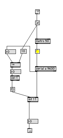 ..what this does.. This brings in serial information. I was using a Keyspan USB-->Serial PDA Adapter. Depending on your adapter and hardware configuration, you may need to use a different port letter. The extra bits are to prevent the odd outliers that my sensor was giving me. They all seemed to fall under the number ten, so MAX only bangs it through if it is more than 10. Turns out that this is a known bug, but it is easy to circumvent. If you have any questions, email me. I willingly share code. sasha@mortalspaces.com |